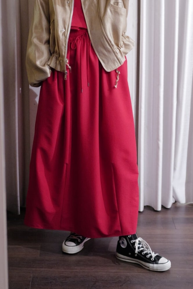 ウエストはドローコードでサイズ調整が可能、細丸紐の共生地にすることで