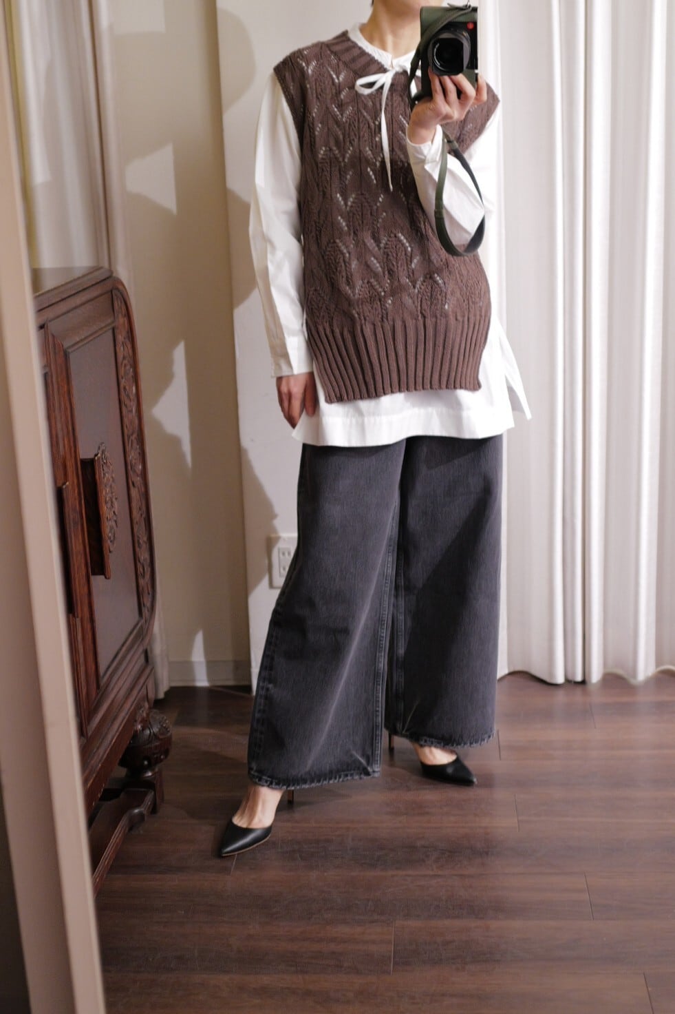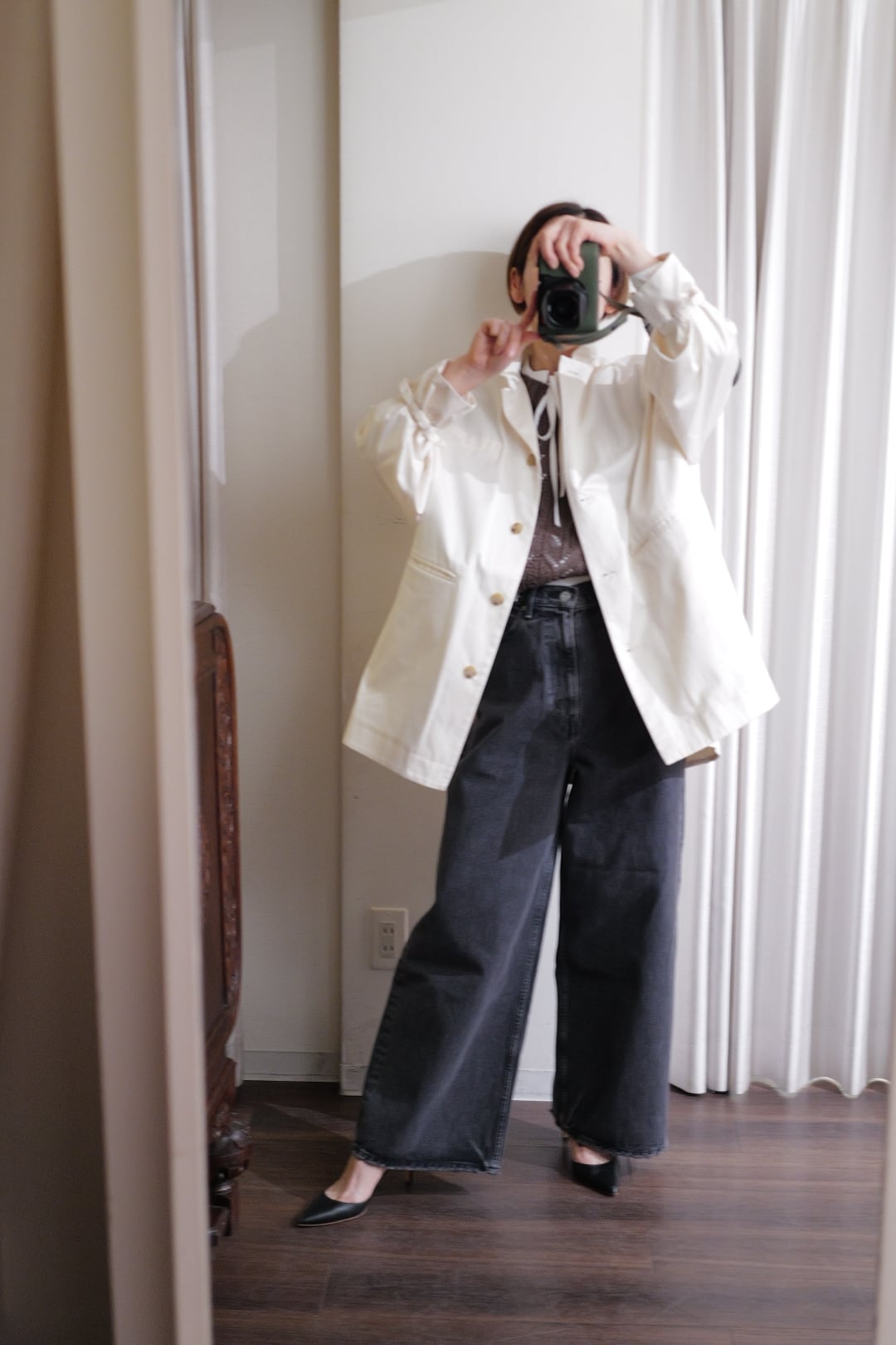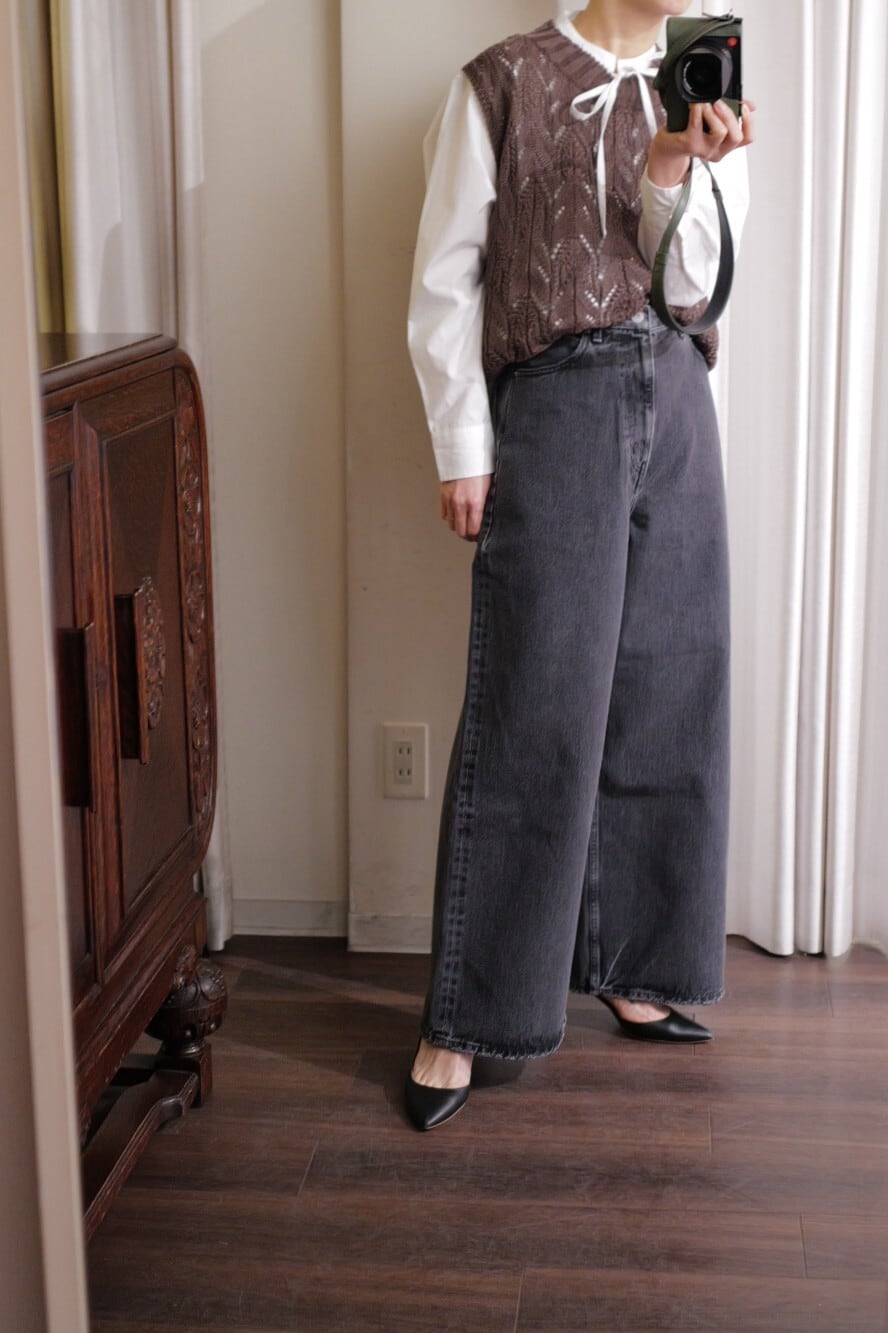 オリジナルの13.5ozデニムは、旧力織機で織られた白耳のセルビッチデニム。隠しリベットや渡り閂、環縫いなど本格的なデニム仕様。フェイド加工は職人の手によって1本ずつ加工を施されたこだわりの加工です。加工している為生地の特性上斜行があります。#020は経糸、横糸ともに硫化ブラックで染め、製品洗い加工の負担を低減した新しい技術を採用。#110は、水を40%、化学薬品を50%削減したサスティナブルな染色。ハイウェストのワイドストレートで、ウェストからミドルヒップのスッキリ感と、わたりから裾の太いシルエットが特徴。外脇はセルビッチ耳を使用。