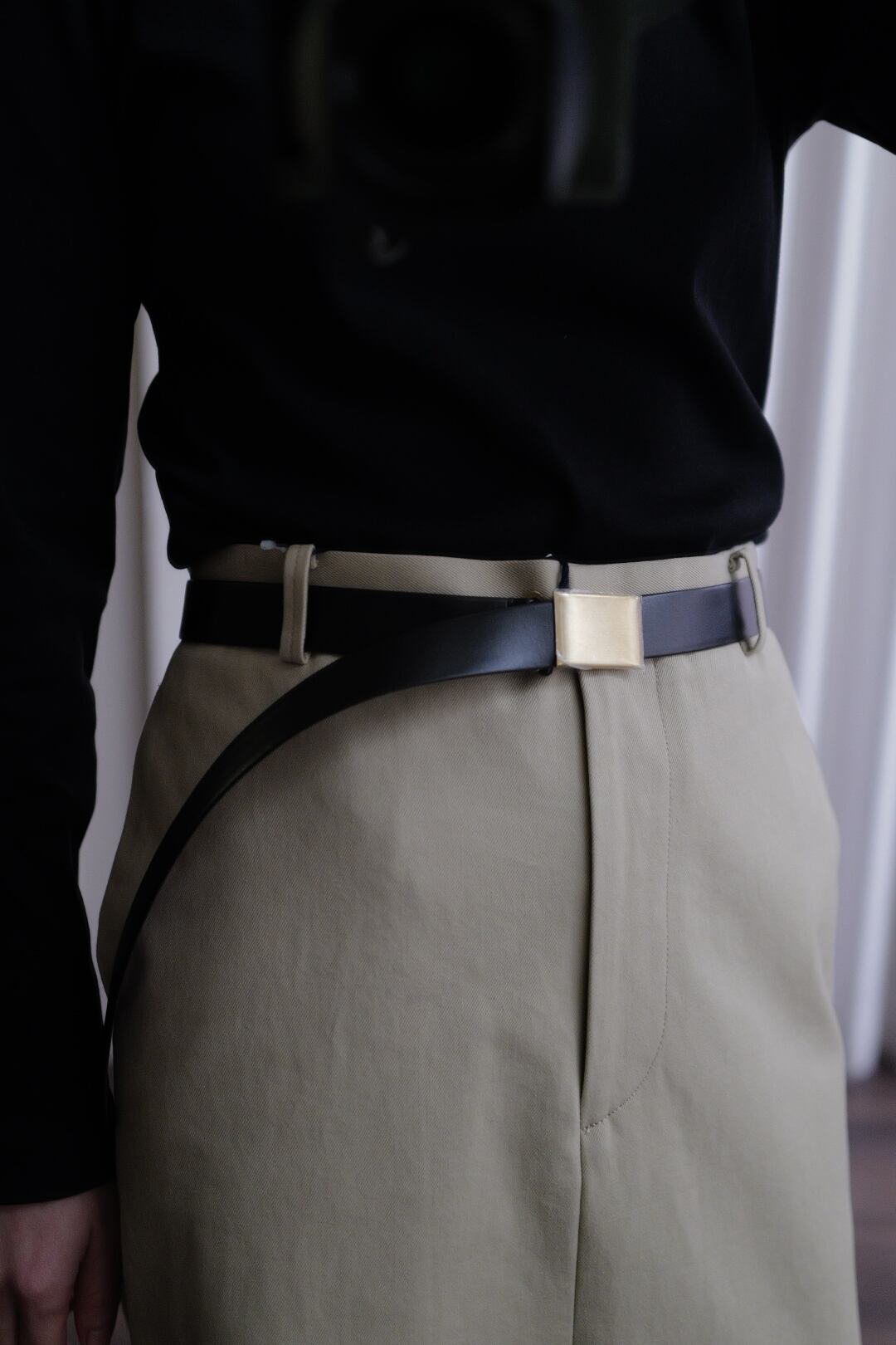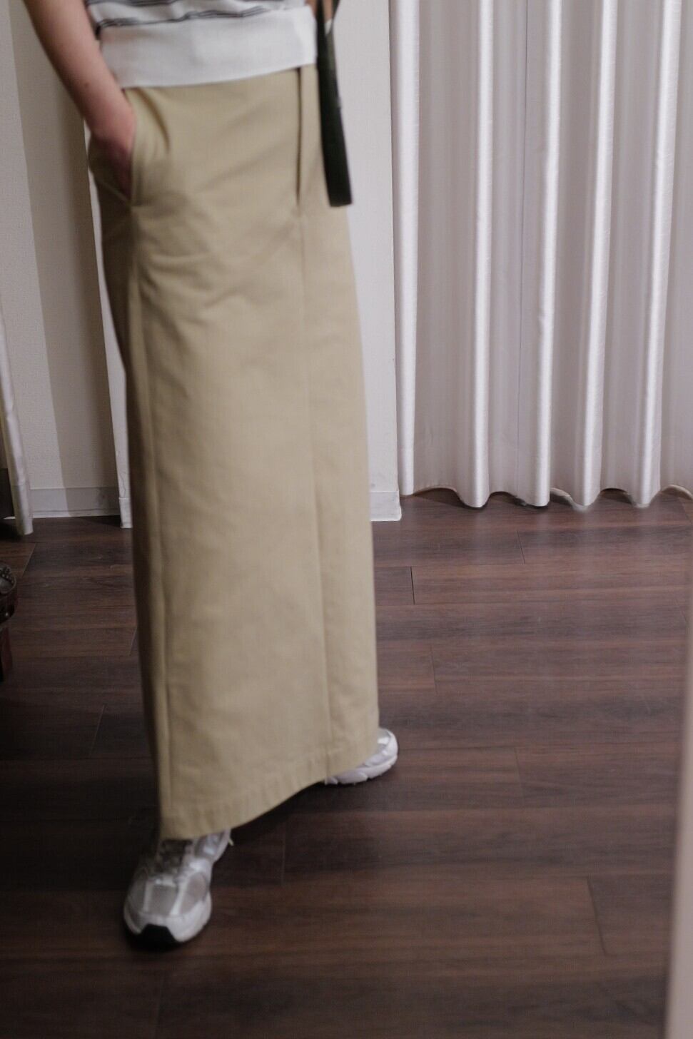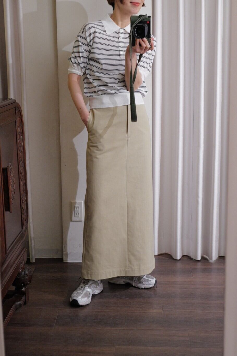 タテ糸にフィンクス超長綿を使用し、ヨコ糸には撚糸加工を施した上質なチノクロス素材です。一般的なチノクロスより毛羽立ちが少なく、滑らかで心地よい肌触りが特徴です。ローウエストの台形シルエットで、トップスとのバランスが取りやすく、幅広いスタイリングに対応可能なスカートに仕上げました。