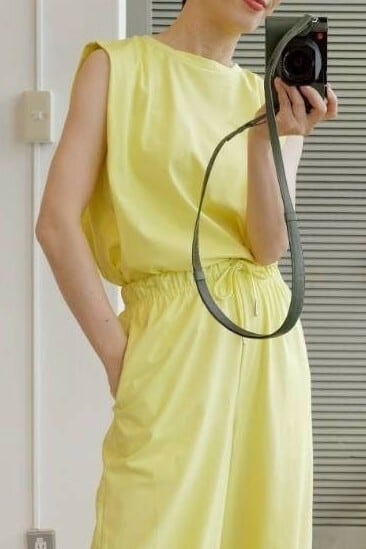 同素材ワイドパンツとのセットアップ着用もおすすめです。