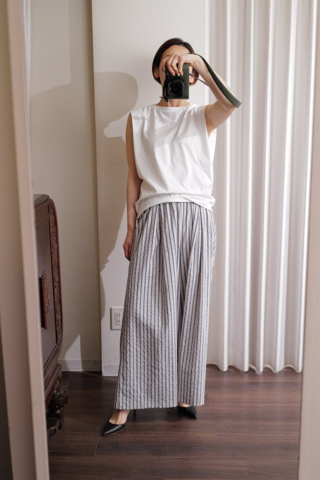 同素材ワイドパンツとのセットアップ着用もおすすめです。