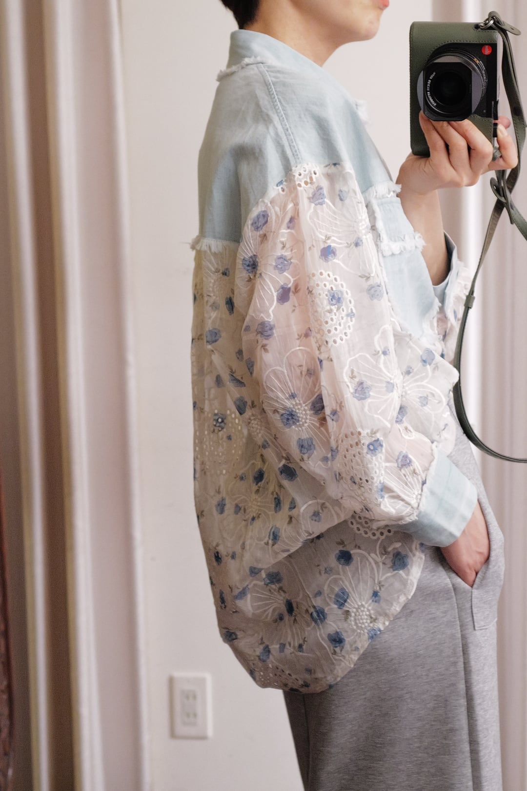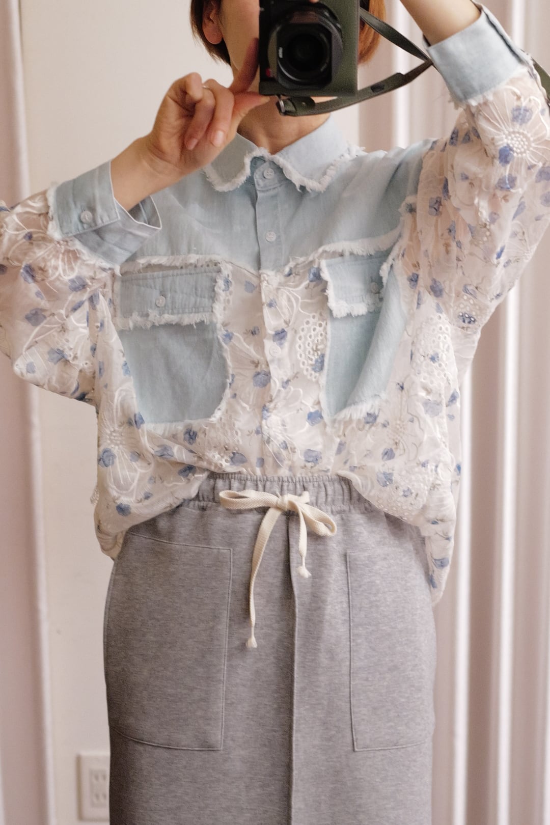 シア感のある生地が特徴な薄いデニム生地とのコンビブラウスです。