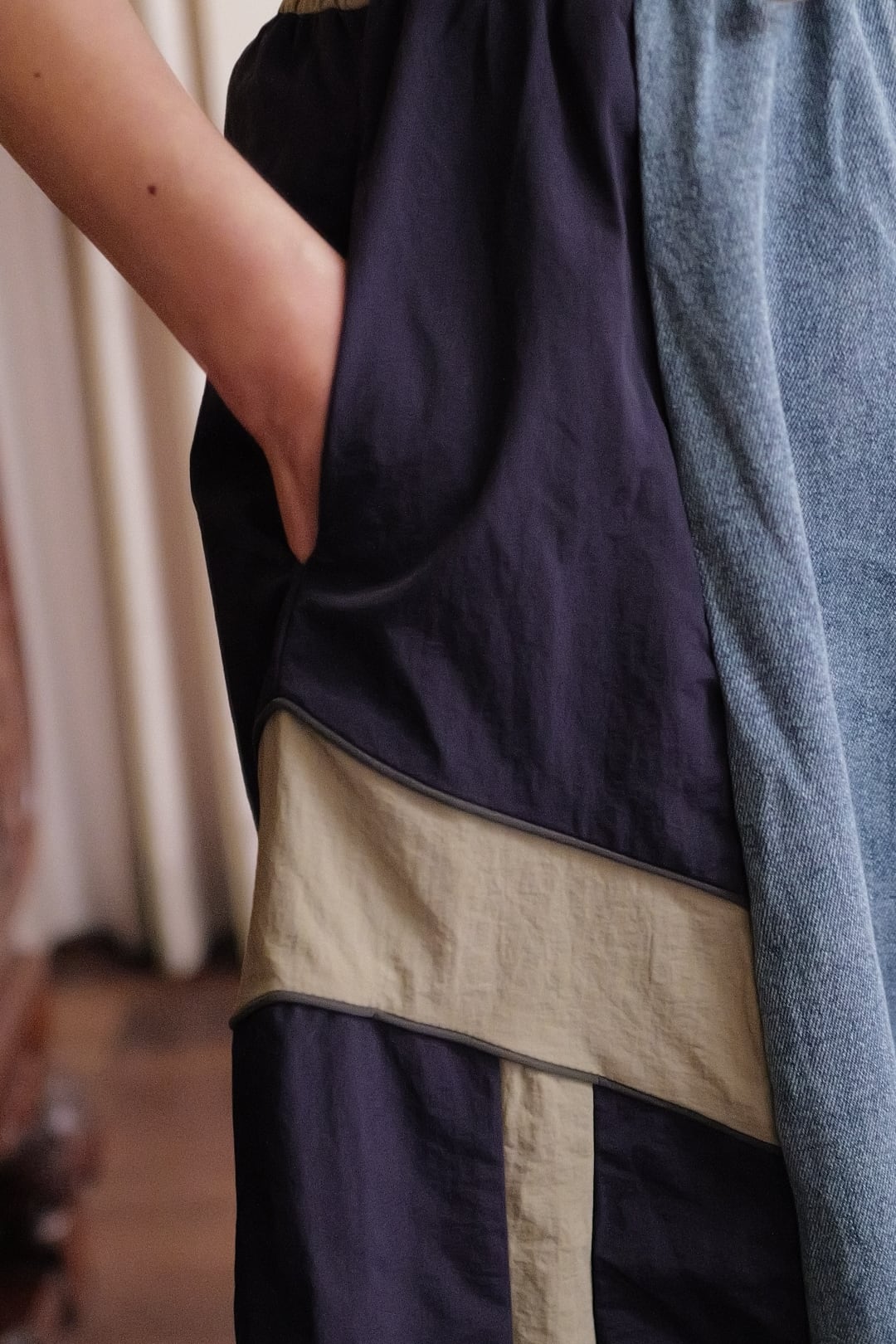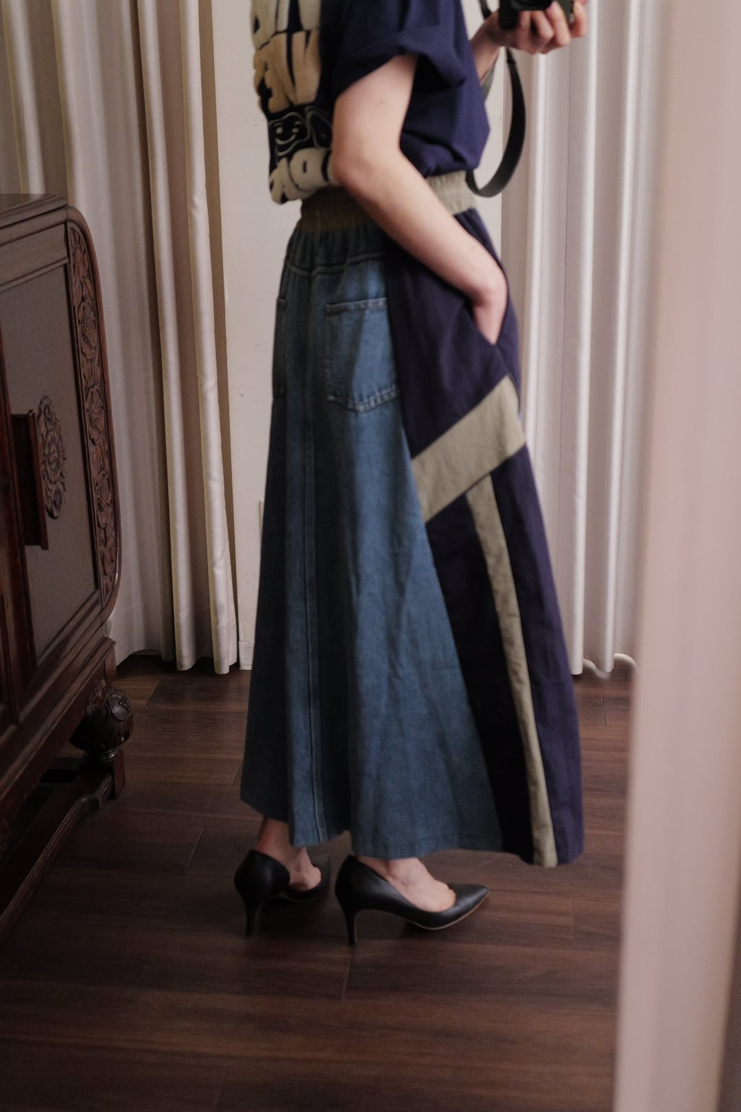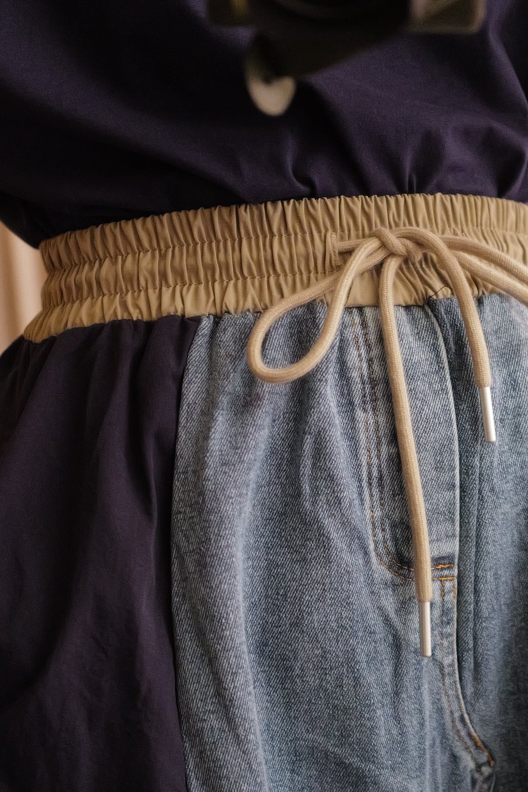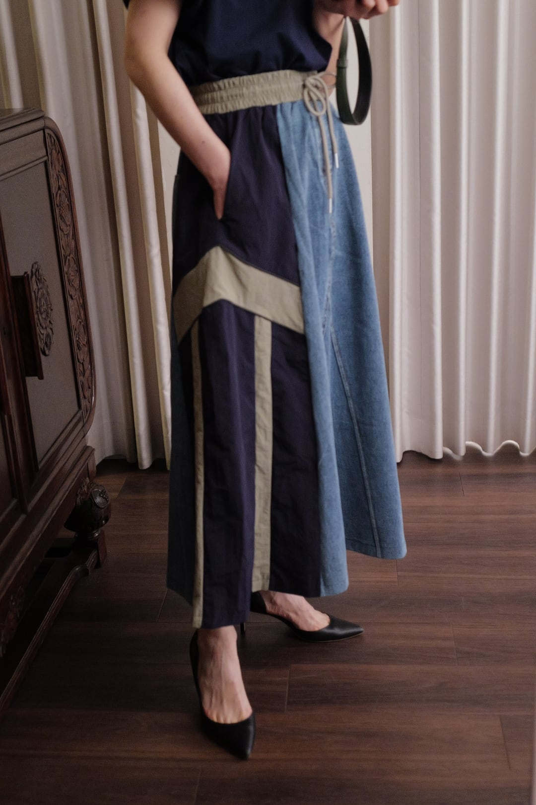 ◾️素材 デニム部分 コットン100% 布帛部分 ポリエステル100% ◾️サイズ FREE ウエスト34cm 着丈87cm ※162㎝着用 ※置き寸法
